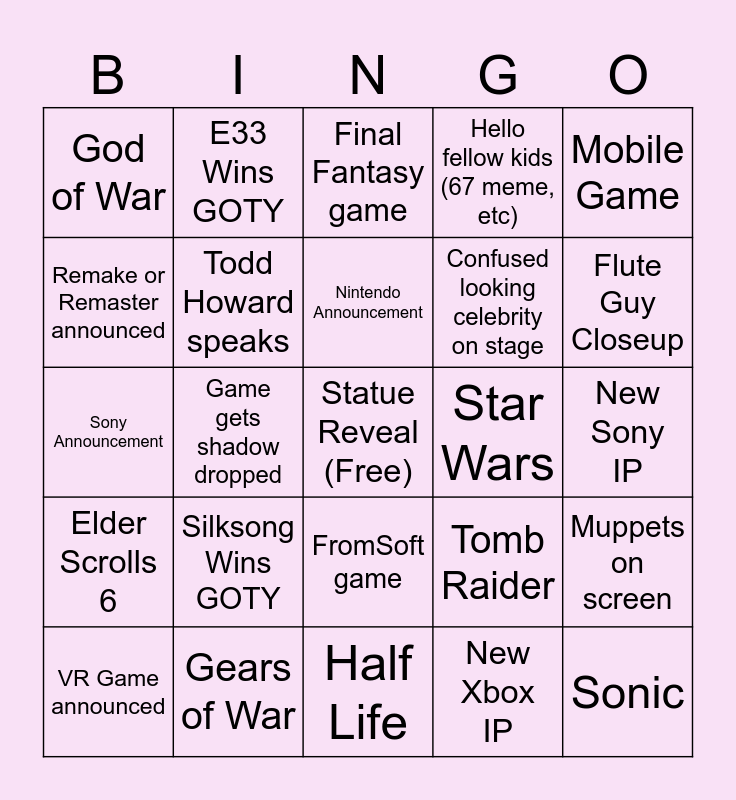 This bingo card has a free space and 30 words: Gears of War, Facebook Gaming, Game gets shadow dropped, Game Speech lasts more than 2 minutes, God of War, Final Fantasy game, Todd Howard speaks, FromSoft game, Star Wars, Half Life, New Sony IP, Sonic, New Xbox IP, New TV Show or Movie, Flute Guy Closeup, Xbox Announcement, Tomb Raider, Elder Scrolls 6, Silksong Wins GOTY, Mobile Game, Sony Announcement, Silent Hill, E33 Wins GOTY, Confused looking celebrity on stage, Remake or Remaster announced, Hello fellow kids (67 meme, etc), Muppets on screen, VR Game announced, Nintendo Announcement and Kojima appears.