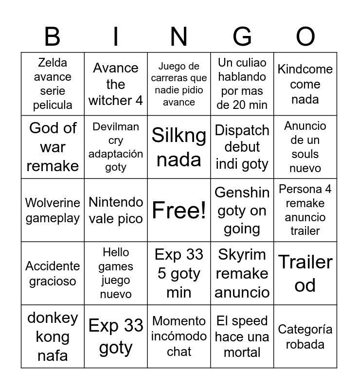 This bingo card has a free space and 24 words: Hello games juego nuevo, Exp 33 goty, Silkng nada, donkey kong nafa, Kindcome come nada, Zelda avance serie pelicula, God of war remake, Avance the witcher 4, Genshin goty on going, Exp 33 5 goty min, Dispatch debut indi goty, Wolverine gameplay, Skyrim remake anuncio, Trailer od, Devilman cry adaptación goty, El speed hace una mortal, Persona 4 remake anuncio trailer, Juego de carreras que nadie pidio avance, Anuncio de un souls nuevo, Nintendo vale pico, Categoría robada, Accidente gracioso, Un culiao hablando por mas de 20 min and Momento incómodo chat.