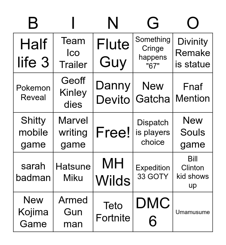 This bingo card has a free space and 24 words: Hatsune Miku, Armed Gun man, Danny Devito, New Kojima Game, Divinity Remake is statue, Half life 3, Pokemon Reveal, Team Ico Trailer, Dispatch is players choice, MH Wilds, New Gatcha, Shitty mobile game, Expedition 33 GOTY, Bill Clinton kid shows up, Geoff Kinley dies, DMC 6, New Souls game, Flute Guy, Fnaf Mention, Marvel writing game, Umamusume, sarah badman, Something Cringe happens "67" and Teto Fortnite.
