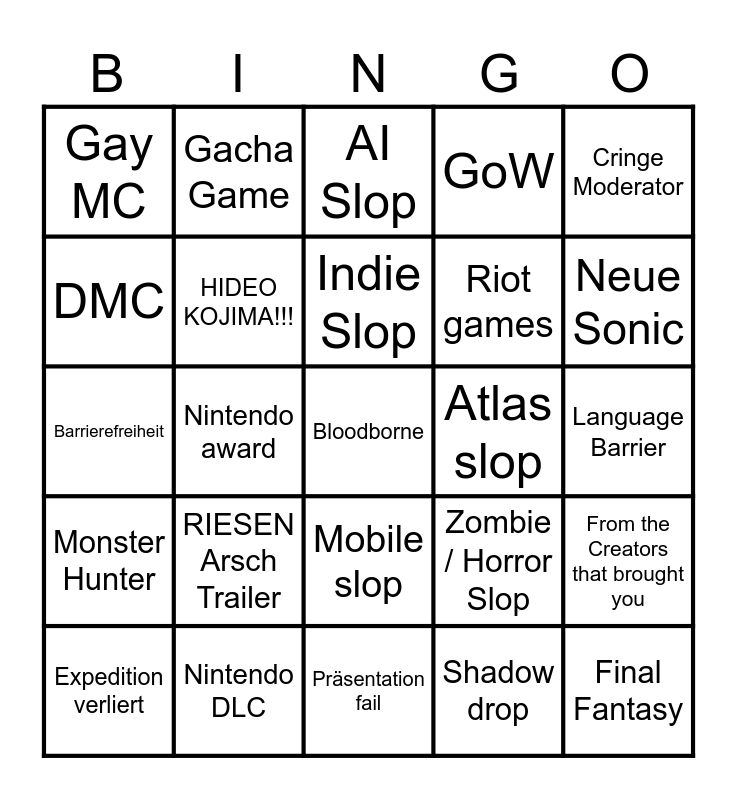 This bingo card has a free space and 24 words: RIESEN Arsch Trailer, Nintendo DLC, Indie Slop, Expedition verliert, Cringe Moderator, Gay MC, DMC, Gacha Game, Atlas slop, Mobile slop, Riot games, Barrierefreiheit, Zombie / Horror Slop, From the Creators that brought you, HIDEO KOJIMA!!!, Shadow drop, Language Barrier, AI Slop, Neue Sonic, Nintendo award, Final Fantasy, Monster Hunter, GoW and Präsentation fail.