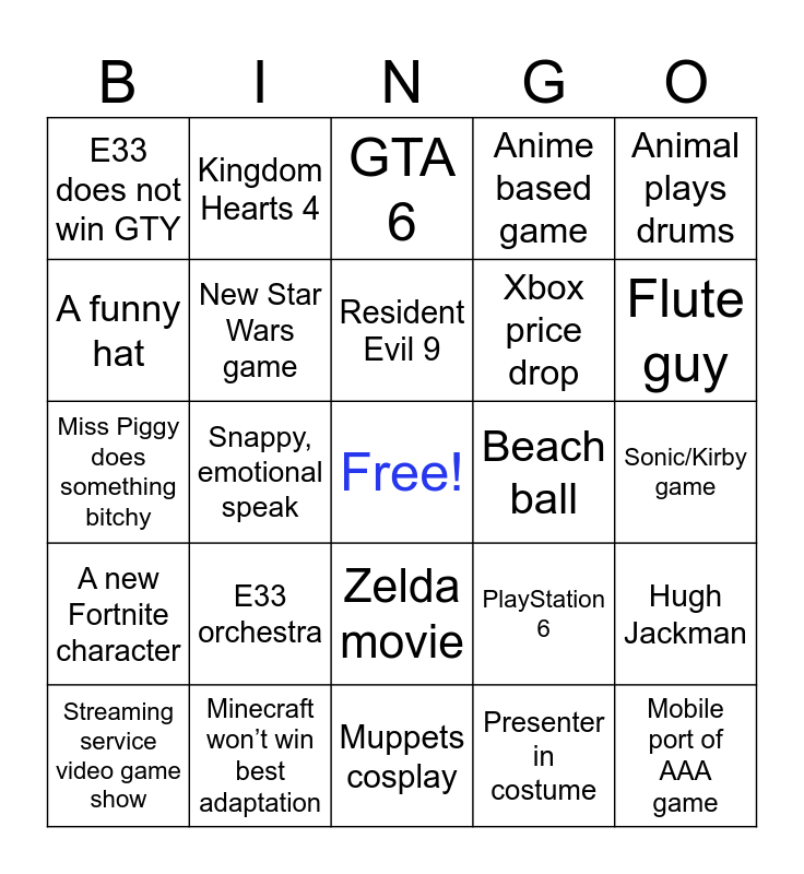 This bingo card has a free space and 24 words: E33 orchestra, Minecraft won’t win best adaptation, Resident Evil 9, Streaming service video game show, Animal plays drums, E33 does not win GTY, A funny hat, Kingdom Hearts 4, Beach ball, Zelda movie, Xbox price drop, Miss Piggy does something bitchy, PlayStation 6, Hugh Jackman, New Star Wars game, Presenter in costume, Sonic/Kirby game, GTA 6, Flute guy, Snappy, emotional speak, Mobile port of AAA game, A new Fortnite character, Anime based game and Muppets cosplay.