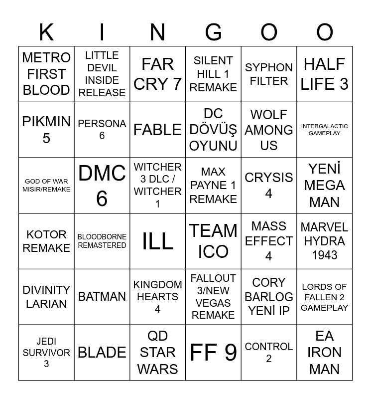 This bingo card has 36 words: FALLOUT 3/NEW VEGAS REMAKE, KINGDOM HEARTS 4, FF 9, PIKMIN 5, KOTOR REMAKE, MAX PAYNE 1 REMAKE, PERSONA 6, QD STAR WARS, SYPHON FILTER, CORY BARLOG YENİ IP, INTERGALACTIC GAMEPLAY, SILENT HILL 1 REMAKE, LORDS OF FALLEN 2 GAMEPLAY, DMC 6, DC DÖVÜŞ OYUNU, METRO FIRST BLOOD, DIVINITY LARIAN, CRYSIS 4, GOD OF WAR MISIR/REMAKE, FAR CRY 7, WITCHER 3 DLC / WITCHER 1, BLOODBORNE REMASTERED, TEAM ICO, ILL, MASS EFFECT 4, LITTLE DEVIL INSIDE RELEASE, WOLF AMONG US, BLADE, FABLE, HALF LIFE 3, EA IRON MAN, JEDI SURVIVOR 3, MARVEL HYDRA 1943, YENİ MEGA MAN, BATMAN and CONTROL 2.