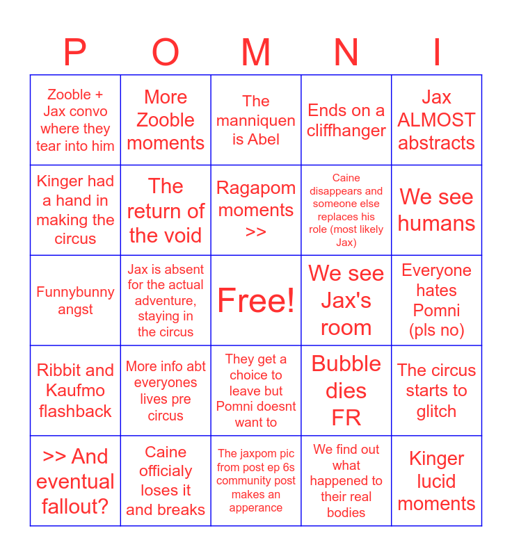 This bingo card has a free space and 24 words: More info abt everyones lives pre circus, Caine officialy loses it and breaks, Ragapom moments >>, >> And eventual fallout?, Jax ALMOST abstracts, Zooble + Jax convo where they tear into him, Kinger had a hand in making the circus, More Zooble moments, We see Jax's room, They get a choice to leave but Pomni doesnt want to, Caine disappears and someone else replaces his role (most likely Jax), Funnybunny angst, Bubble dies FR, The circus starts to glitch, The return of the void, We find out what happened to their real bodies, Everyone hates Pomni (pls no), The manniquen is Abel, We see humans, Jax is absent for the actual adventure, staying in the circus, Kinger lucid moments, Ribbit and Kaufmo flashback, Ends on a cliffhanger and The jaxpom pic from post ep 6s community post makes an apperance.