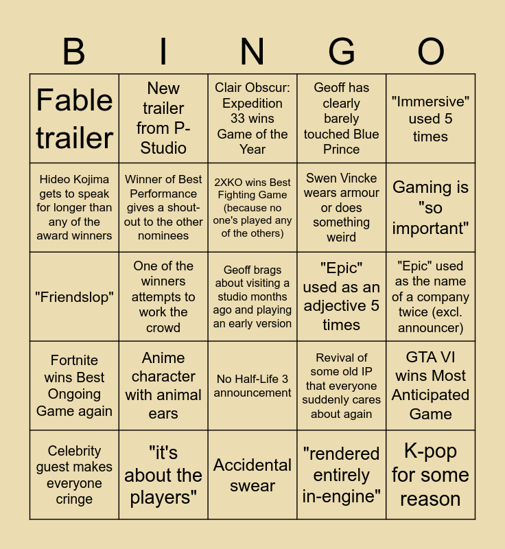 This bingo card has a free space and 24 words: Anime character with animal ears, "it's about the players", 2XKO wins Best Fighting Game (because no one's played any of the others), Celebrity guest makes everyone cringe, "Immersive" used 5 times, Fable trailer, Hideo Kojima gets to speak for longer than any of the award winners, New trailer from P-Studio, "Epic" used as an adjective 5 times, No Half-Life 3 announcement, Swen Vincke wears armour or does something weird, "Friendslop", Revival of some old IP that everyone suddenly cares about again, GTA VI wins Most Anticipated Game, Winner of Best Performance gives a shout-out to the other nominees, "rendered entirely in-engine", "Epic" used as the name of a company twice (excl. announcer), Clair Obscur: Expedition 33 wins Game of the Year, Gaming is "so important", One of the winners attempts to work the crowd, K-pop for some reason, Fortnite wins Best Ongoing Game again, Geoff has clearly barely touched Blue Prince and Accidental swear.