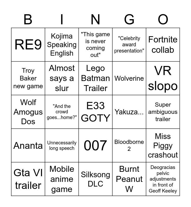 This bingo card has a free space and 24 words: Unnecessarily long speech, Mobile anime game, Lego Batman Trailer, Gta VI trailer, Fortnite collab, RE9, Troy Baker new game, Kojima Speaking English, Yakuza..., 007, Wolverine, Wolf Amogus Dos, Bloodborne 2, Miss Piggy crashout, Almost says a slur, Burnt Peanut W, Super ambiguous trailer, "This game is never coming out", VR slopo, "And the crowd goes...home?", Deogracias pelvic adjustments in front of Geoff Keeley, Ananta, "Celebrity award presentation" and Silksong DLC.