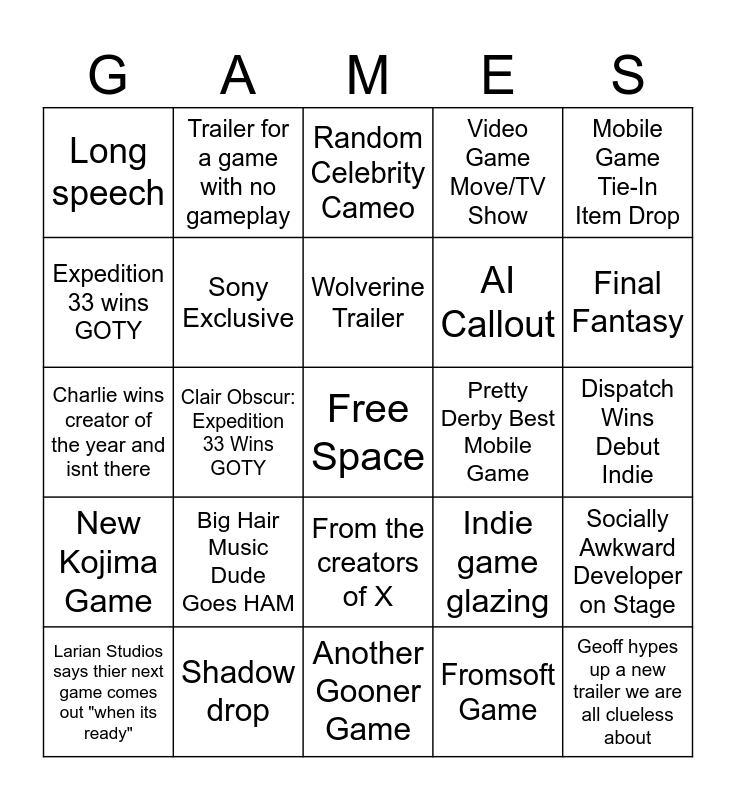 This bingo card has a free space and 24 words: Big Hair Music Dude Goes HAM, Shadow drop, Wolverine Trailer, Larian Studios says thier next game comes out "when its ready", Mobile Game Tie-In Item Drop, Long speech, Expedition 33 wins GOTY, Trailer for a game with no gameplay, Pretty Derby Best Mobile Game, From the creators of X, AI Callout, Charlie wins creator of the year and isnt there, Indie game glazing, Socially Awkward Developer on Stage, Sony Exclusive, Fromsoft Game, Dispatch Wins Debut Indie, Random Celebrity Cameo, Final Fantasy, Clair Obscur: Expedition 33 Wins GOTY, Geoff hypes up a new trailer we are all clueless about, New Kojima Game, Video Game Move/TV Show and Another Gooner Game.
