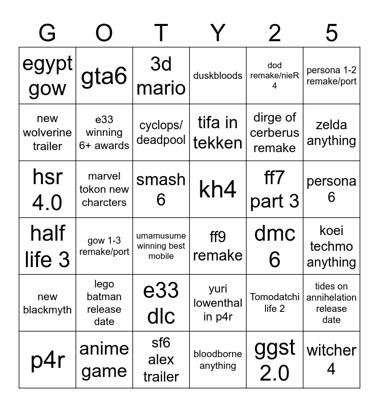 This bingo card has 36 words: yuri lowenthal in p4r, e33 dlc, bloodborne anything, new wolverine trailer, half life 3, kh4, e33 winning 6+ awards, sf6 alex trailer, dod remake/nieR 4, Tomodatchi life 2, zelda anything, duskbloods, tides on annihelation release date, marvel tokon new charcters, tifa in tekken, egypt gow, new blackmyth, ff7 part 3, hsr 4.0, 3d mario, smash 6, gow 1-3 remake/port, ff9 remake, umamusume winning best mobile, dmc 6, gta6, dirge of cerberus remake, anime game, cyclops/ deadpool, persona 1-2 remake/port, witcher 4, p4r, koei techmo anything, persona 6, lego batman release date and ggst 2.0.