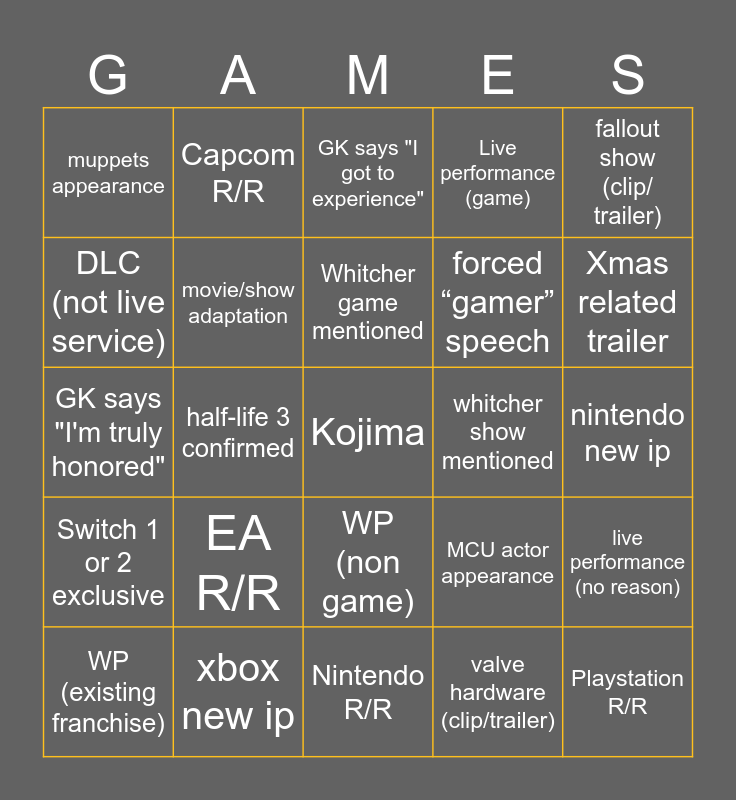 This bingo card has a free space and 46 words: Ubisoft R/R, Playstation R/R, Xbox R/R, Nintendo R/R, EA R/R, Square R/R, Capcom R/R, Other R/R, DLC (not live service), Live service update, movie/show adaptation, Live performance (game), live performance (no reason), MCU actor appearance, DCU actor appearance, popular show actor, Whitcher game mentioned, whitcher show mentioned, fallout game announcement, fallout show (clip/ trailer), half-life 3 confirmed, valve hardware (clip/trailer), muppets appearance, forced “gamer” speech, new hardware announcement, Xmas related trailer, WP (existing franchise), WP (New IP), WP (non game), Switch 1 or 2 exclusive, Playstation exclusive, xbox published, ubisoft new ip, EA new ip, Playstation new ip, xbox new ip, nintendo new ip, Other new ip, GK says "Completely Insane", GK says "I Cant believe", GK says "Never before seen", GK says "I got to experience", GK says "I'm truly honored", GK says "For the First time", GK says "Over (10+) years" and GK says "you'll never guess".