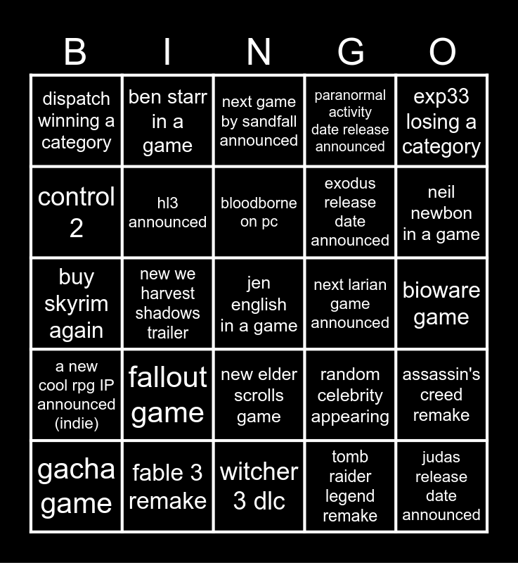This bingo card has 25 words: fallout game, witcher 3 dlc, bloodborne on pc, gacha game, exp33 losing a category, dispatch winning a category, control 2, ben starr in a game, next larian game announced, new elder scrolls game, exodus release date announced, buy skyrim again, random celebrity appearing, assassin's creed remake, hl3 announced, judas release date announced, bioware game, next game by sandfall announced, neil newbon in a game, new we harvest shadows trailer, jen english in a game, fable 3 remake, a new cool rpg IP announced (indie), paranormal activity date release announced and tomb raider legend remake.