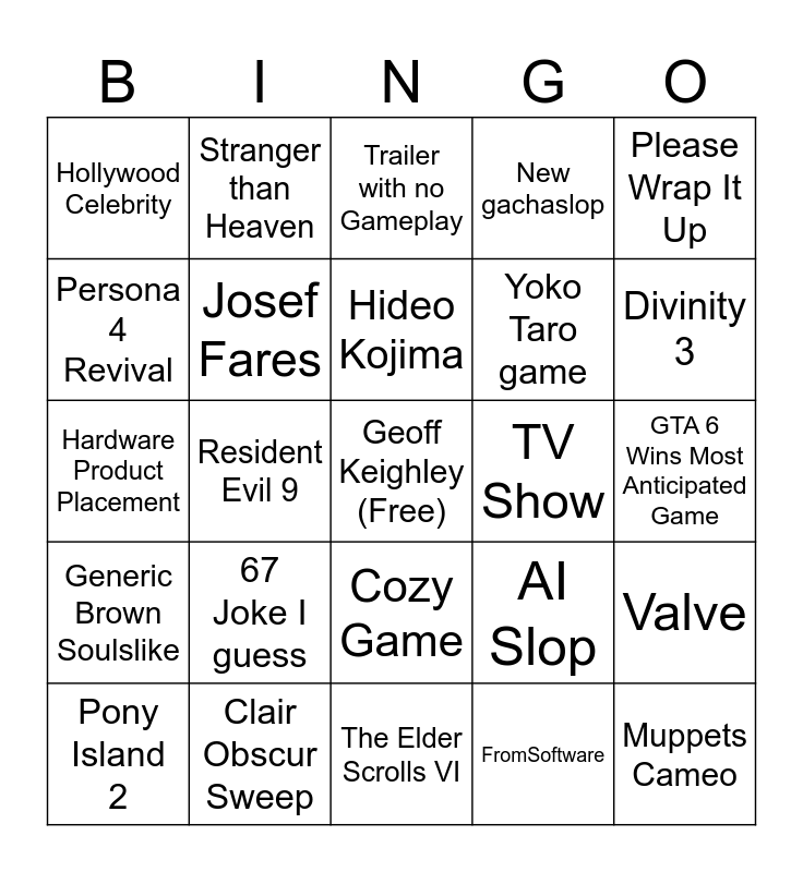 This bingo card has a free space and 24 words: 67 Joke I guess, Clair Obscur Sweep, Hideo Kojima, Pony Island 2, Please Wrap It Up, Hollywood Celebrity, Persona 4 Revival, Stranger than Heaven, TV Show, Cozy Game, Yoko Taro game, Hardware Product Placement, AI Slop, Valve, Josef Fares, FromSoftware, GTA 6 Wins Most Anticipated Game, Trailer with no Gameplay, Divinity 3, Resident Evil 9, Muppets Cameo, Generic Brown Soulslike, New gachaslop and The Elder Scrolls VI.