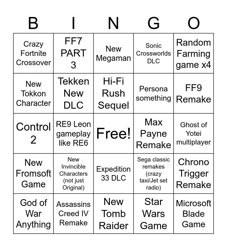 This bingo card has a free space and 24 words: New Invincible Characters (not just Original), Assassins Creed IV Remake, Hi-Fi Rush Sequel, God of War Anything, Random Farming game x4, Crazy Fortnite Crossover, New Tokkon Character, FF7 PART 3, Max Payne Remake, Expedition 33 DLC, Persona something, Control 2, Sega classic remakes (crazy taxi/Jet set radio), Chrono Trigger Remake, Tekken New DLC, Star Wars Game, Ghost of Yotei multiplayer, New Megaman, FF9 Remake, RE9 Leon gameplay like RE6, Microsoft Blade Game, New Fromsoft Game, Sonic Crossworlds DLC and New Tomb Raider.