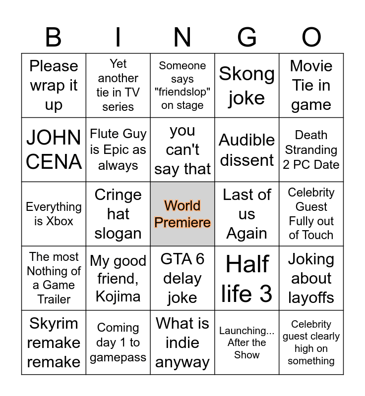 This bingo card has a free space and 45 words: Clair Obscur joke, Celebrity guest clearly high on something, WTF IS THAT TRAILER, Skyrim remake remake, Steam machine joke, Launching... After the Show, Someone says "friendslop" on stage, Okami 3 trailer, Movie Tie in game, Coming day 1 to gamepass, Skong joke, Last of us Again, GTA 6 delay joke, My good friend, Kojima, Esquie on stage!!!, What is indie anyway, Joseph Fares Being unhinged, Everything is Xbox, Music number that isn't e33, Death Stranding 2 PC Date, Yet another tie in TV series, 6/7 joke :vomit:, bad cosplay to promote a game, Please wrap it up, Peak Joke, Celebrity Guest Fully out of Touch, Gen AI trailer, We need a mo cap award, Half life 3, The most Nothing of a Game Trailer, Goof ball wins and goofs on stage, Joking about layoffs, The Duskbloods, New poison swamp just dropped, Blood born ....2?, Cringe hat slogan, Powered by AI as a feature, Trailer Tonal Whiplash, Bizarre product placement, you can't say that, JOHN CENA, Audible dissent, Helldiving into the show, Flute Guy is Epic as always and the slop trailer block (3+ in a row).