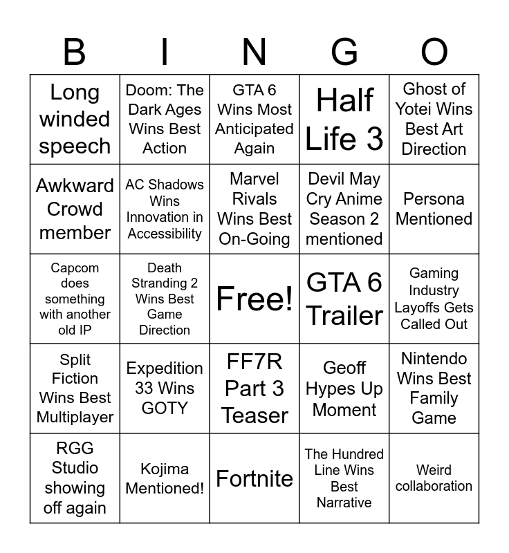 This bingo card has a free space and 32 words: The Hundred Line Wins Best Narrative, Expedition 33 Wins Best RPG, Death Stranding 2 Wins Best Game Direction, Lost Records Wins Games for Impact, Split Fiction Wins Best Multiplayer, AC Shadows Wins Innovation in Accessibility, Ghost of Yotei Wins Best Art Direction, Nintendo Wins Best Family Game, Doom: The Dark Ages Wins Best Action, Ben Starr Wins Best Performance, Marvel Rivals Wins Best On-Going, GTA 6 Wins Most Anticipated Again, Sonic Racing: CrossWorlds Wins Best Racing, TLOU S2 Wins Best Adaptation, GTA 6 Trailer, OD Trailer, RGG Studio showing off again, Capcom does something with another old IP, FF7R Part 3 Teaser, Expedition 33 Wins GOTY, Geoff Hypes Up Moment, Geoff trolls using Sid: The Science Kid, Gaming Industry Layoffs Gets Called Out, Kojima Mentioned!, Weird collaboration, Half Life 3, Devil May Cry Anime Season 2 mentioned, Awkward Crowd member, Long winded speech, Fortnite, AVAILABLE NOW! and Persona Mentioned.