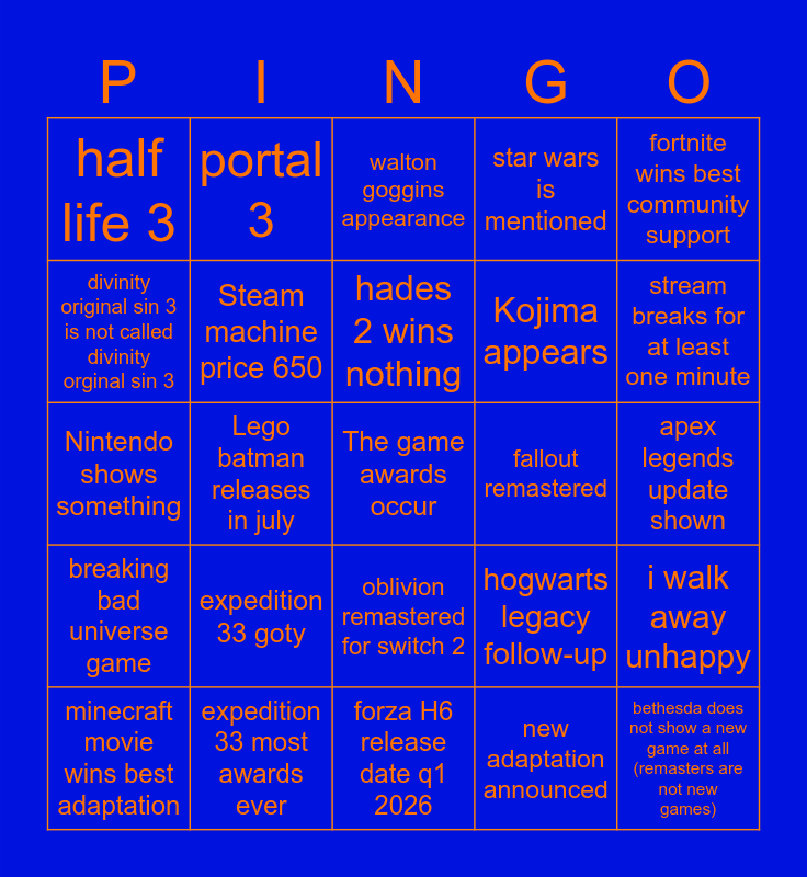 This bingo card has a free space and 24 words: expedition 33 goty, expedition 33 most awards ever, hades 2 wins nothing, minecraft movie wins best adaptation, fortnite wins best community support, half life 3, divinity original sin 3 is not called divinity orginal sin 3, portal 3, fallout remastered, oblivion remastered for switch 2, Kojima appears, Nintendo shows something, hogwarts legacy follow-up, i walk away unhappy, Steam machine price 650, new adaptation announced, apex legends update shown, walton goggins appearance, stream breaks for at least one minute, Lego batman releases in july, bethesda does not show a new game at all (remasters are not new games), breaking bad universe game, star wars is mentioned and forza H6 release date q1 2026.