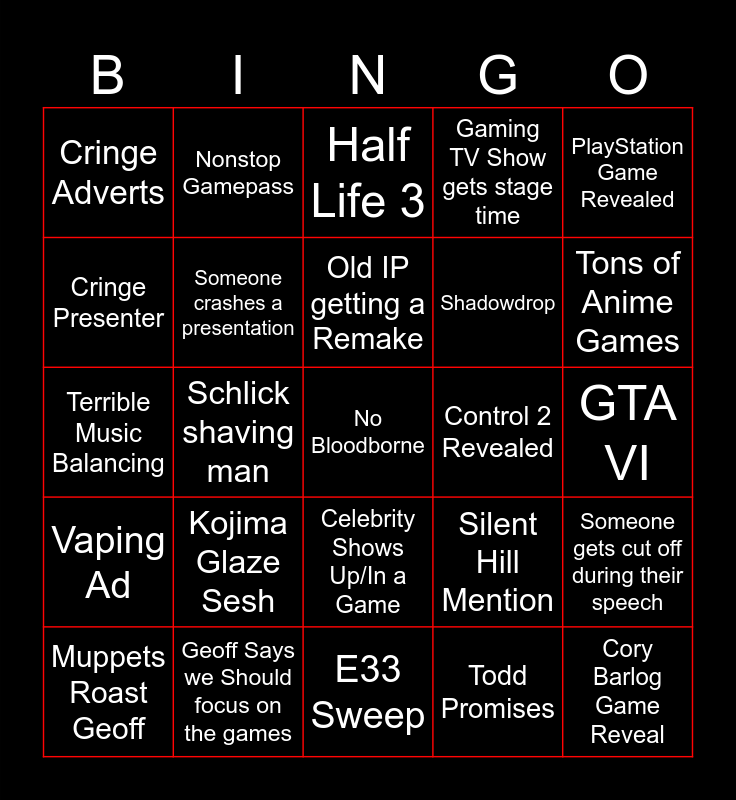 This bingo card has a free space and 24 words: Kojima Glaze Sesh, Geoff Says we Should focus on the games, Old IP getting a Remake, Muppets Roast Geoff, PlayStation Game Revealed, Cringe Adverts, Cringe Presenter, Nonstop Gamepass, Control 2 Revealed, Celebrity Shows Up/In a Game, Shadowdrop, Terrible Music Balancing, Silent Hill Mention, Someone gets cut off during their speech, Someone crashes a presentation, Todd Promises, GTA VI, Half Life 3, Tons of Anime Games, Schlick shaving man, Cory Barlog Game Reveal, Vaping Ad, Gaming TV Show gets stage time and E33 Sweep.