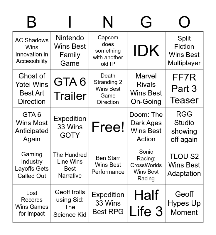 This bingo card has a free space and 25 words: The Hundred Line Wins Best Narrative, Expedition 33 Wins Best RPG, Death Stranding 2 Wins Best Game Direction, Lost Records Wins Games for Impact, Split Fiction Wins Best Multiplayer, AC Shadows Wins Innovation in Accessibility, Ghost of Yotei Wins Best Art Direction, Nintendo Wins Best Family Game, Doom: The Dark Ages Wins Best Action, Ben Starr Wins Best Performance, Marvel Rivals Wins Best On-Going, GTA 6 Wins Most Anticipated Again, Sonic Racing: CrossWorlds Wins Best Racing, TLOU S2 Wins Best Adaptation, GTA 6 Trailer, OD Trailer, RGG Studio showing off again, Capcom does something with another old IP, FF7R Part 3 Teaser, Expedition 33 Wins GOTY, Geoff Hypes Up Moment, Geoff trolls using Sid: The Science Kid, Gaming Industry Layoffs Gets Called Out, IDK and Half Life 3.