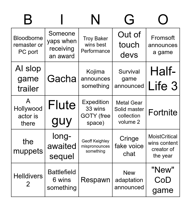 This bingo card has a free space and 24 words: long-awaited sequel, Battlefield 6 wins something, Kojima announces something, Helldivers 2, Fromsoft announces a game, Bloodborne remaster or PC port, AI slop game trailer, Someone yaps when receiving an award, Metal Gear Solid master collection volume 2, Geoff Keighley mispronounces something, Survival game announced, A Hollywood actor is there, Cringe fake voice chat, MoistCritical wins content creator of the year, Gacha, New adaptation announced, Fortnite, Troy Baker wins best Performance, Half-Life 3, Flute guy, "New" CoD game, the muppets, Out of touch devs and Respawn.