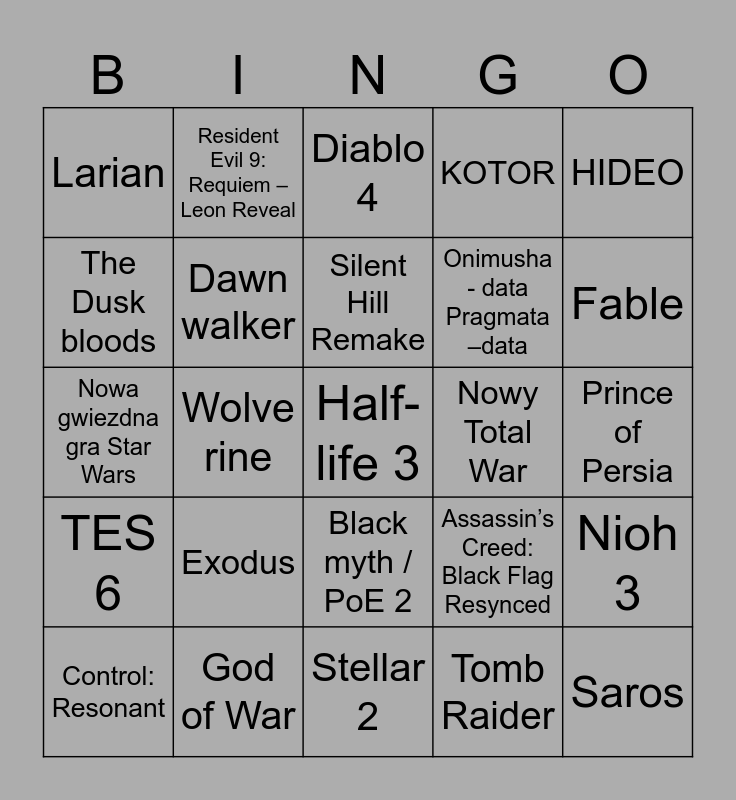 This bingo card has a free space and 24 words: Exodus, God of War, Silent Hill Remake, Control: Resonant, HIDEO, Larian, The Dusk bloods, Resident Evil 9: Requiem – Leon Reveal, Nowy Total War, Black myth / PoE 2, Onimusha - data Pragmata –data, Nowa gwiezdna gra Star Wars, Assassin’s Creed: Black Flag Resynced, Nioh 3, Dawn walker, Tomb Raider, Prince of Persia, Diablo 4, Fable, Wolve rine, Saros, TES 6, KOTOR and Stellar 2.