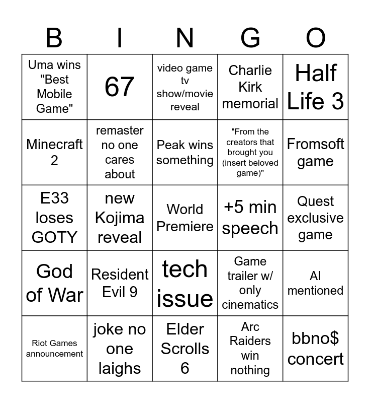 This bingo card has a free space and 24 words: Resident Evil 9, joke no one laighs, Peak wins something, Riot Games announcement, Half Life 3, Uma wins "Best Mobile Game", Minecraft 2, 67, +5 min speech, tech issue, "From the creators that brought you (insert beloved game)", E33 loses GOTY, Game trailer w/ only cinematics, AI mentioned, remaster no one cares about, Arc Raiders win nothing, Quest exclusive game, video game tv show/movie reveal, Fromsoft game, new Kojima reveal, bbno$ concert, God of War, Charlie Kirk memorial and Elder Scrolls 6.