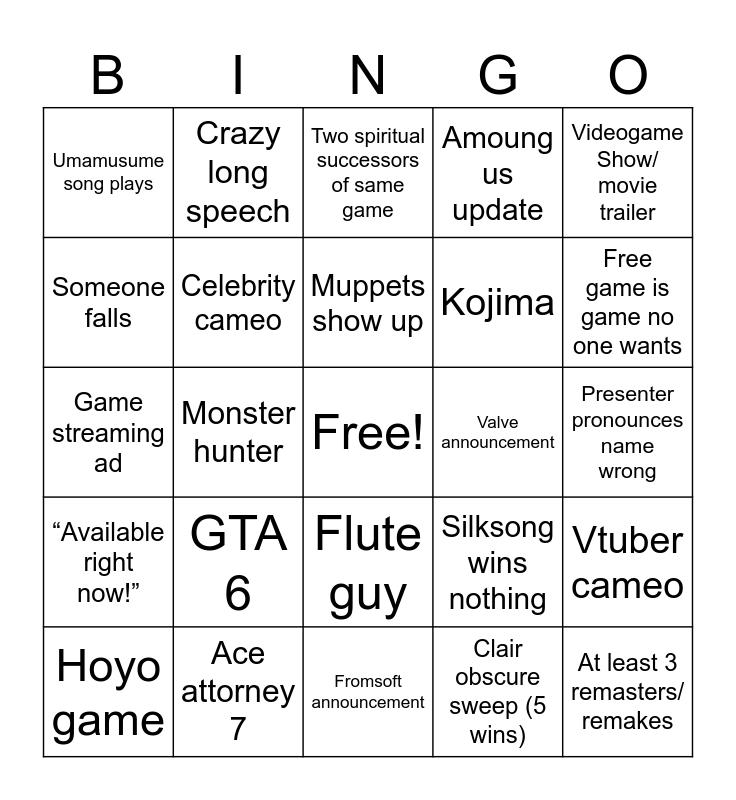This bingo card has a free space and 24 words: GTA 6, Ace attorney 7, Muppets show up, Hoyo game, Videogame Show/ movie trailer, Umamusume song plays, Someone falls, Crazy long speech, Valve announcement, Flute guy, Kojima, Game streaming ad, Silksong wins nothing, Vtuber cameo, Celebrity cameo, Clair obscure sweep (5 wins), Presenter pronounces name wrong, Two spiritual successors of same game, Free game is game no one wants, Monster hunter, At least 3 remasters/ remakes, “Available right now!”, Amoung us update and Fromsoft announcement.