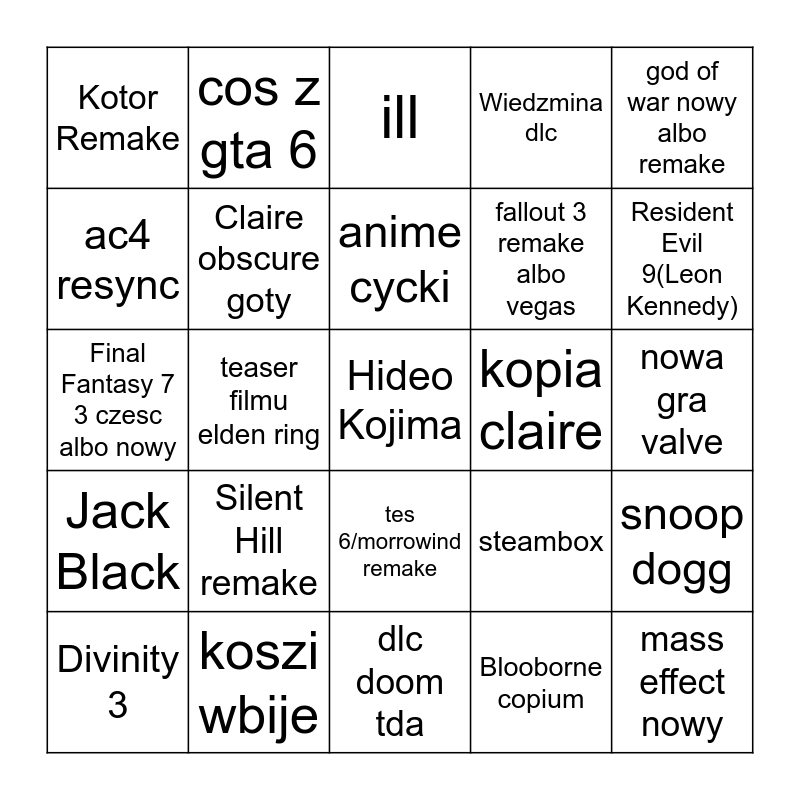 This bingo card has a free space and 24 words: Silent Hill remake, koszi wbije, anime cycki, Divinity 3, god of war nowy albo remake, Kotor Remake, ac4 resync, cos z gta 6, kopia claire, tes 6/morrowind remake, fallout 3 remake albo vegas, Final Fantasy 7 3 czesc albo nowy, steambox, snoop dogg, Claire obscure goty, Blooborne copium, nowa gra valve, ill, Resident Evil 9(Leon Kennedy), teaser filmu elden ring, mass effect nowy, Jack Black, Wiedzmina dlc and dlc doom tda.