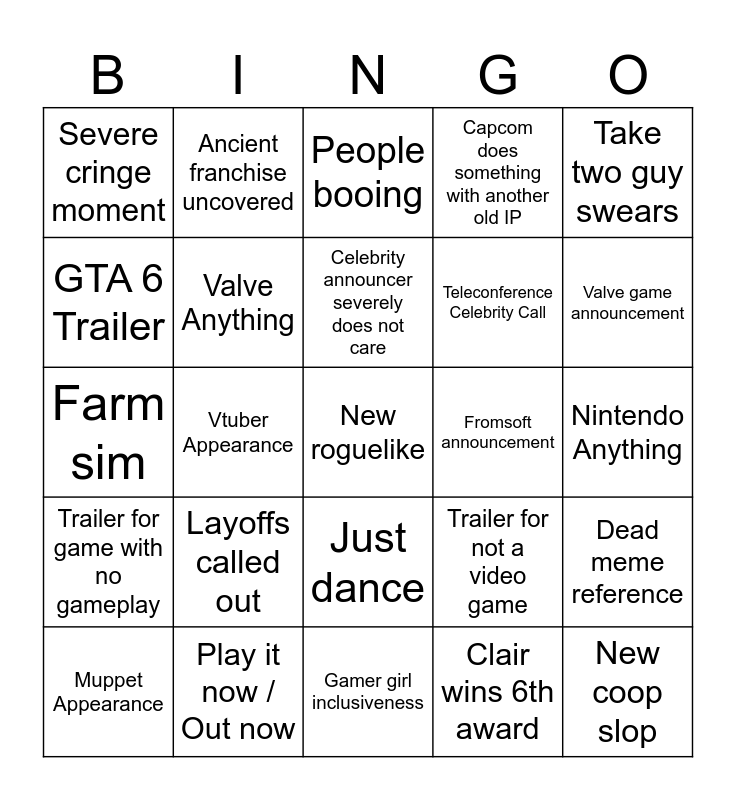 This bingo card has a free space and 24 words: Muppet Appearance, Layoffs called out, Celebrity announcer severely does not care, Clair wins 6th award, Take two guy swears, Severe cringe moment, Ancient franchise uncovered, People booing, Fromsoft announcement, Nintendo Anything, Farm sim, Valve Anything, Trailer for not a video game, Dead meme reference, GTA 6 Trailer, Play it now / Out now, Gamer girl inclusiveness, Capcom does something with another old IP, Valve game announcement, Trailer for game with no gameplay, Vtuber Appearance, Just dance, Teleconference Celebrity Call and New coop slop.