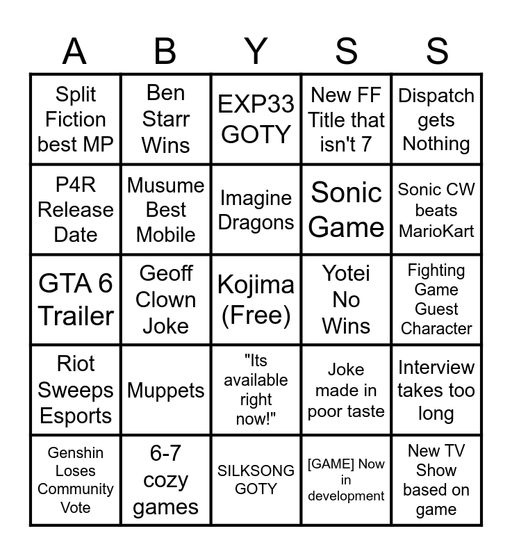 This bingo card has a free space and 24 words: Muppets, 6-7 cozy games, Imagine Dragons, Genshin Loses Community Vote, Dispatch gets Nothing, Split Fiction best MP, P4R Release Date, Ben Starr Wins, Yotei No Wins, "Its available right now!", Sonic Game, GTA 6 Trailer, Joke made in poor taste, Interview takes too long, Musume Best Mobile, [GAME] Now in development, Fighting Game Guest Character, EXP33 GOTY, Sonic CW beats MarioKart, Geoff Clown Joke, New TV Show based on game, Riot Sweeps Esports, New FF Title that isn't 7 and SILKSONG GOTY.