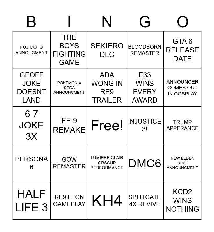 This bingo card has a free space and 24 words: GOW REMASTER, RE9 LEON GAMEPLAY, ADA WONG IN RE9 TRAILER, HALF LIFE 3, GTA 6 RELEASE DATE, FUJIMOTO ANNOUCMENT, GEOFF JOKE DOESNT LAND, THE BOYS FIGHTING GAME, INJUSTICE 3!, LUMIERE CLAIR OBSCUR PERFORMANCE, E33 WINS EVERY AWARD, 6 7 JOKE 3X, DMC6, NEW ELDEN RING ANNOUNCMENT, POKEMON X SEGA ANNOUNCMENT, SPLITGATE 4X REVIVE, TRUMP APPERANCE, SEKIERO DLC, ANNOUNCER COMES OUT IN COSPLAY, FF 9 REMAKE, KCD2 WINS NOTHING, PERSONA 6, BLOODBORN REMASTER and KH4.