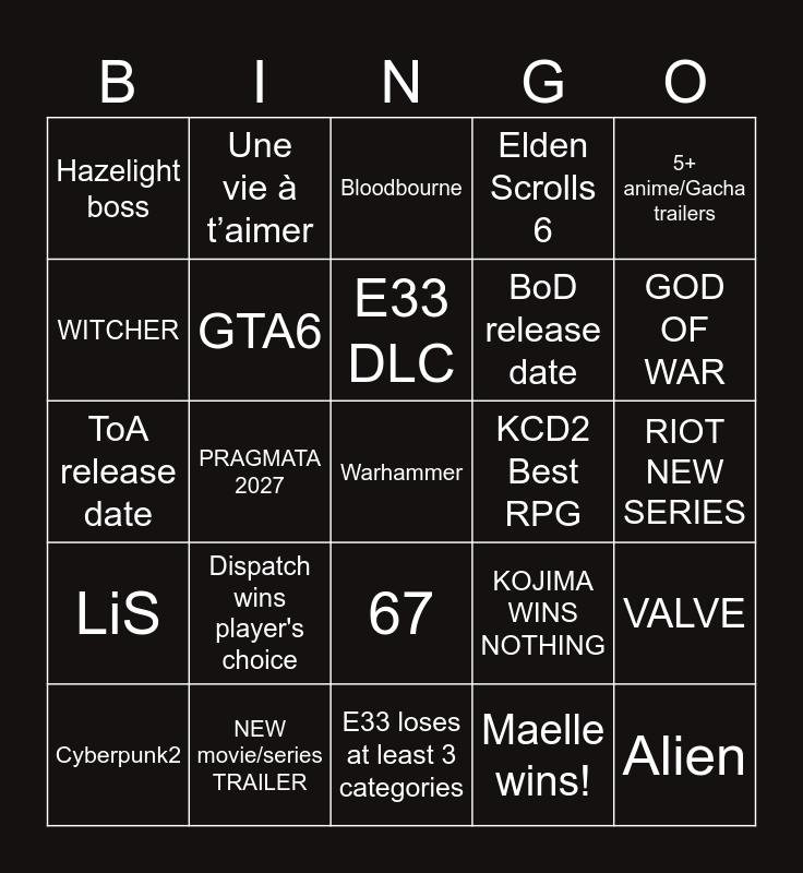 This bingo card has 25 words: Dispatch wins player's choice, E33 loses at least 3 categories, E33 DLC, Cyberpunk2, 5+ anime/Gacha trailers, Hazelight boss, WITCHER, Une vie à t’aimer, KCD2 Best RPG, 67, BoD release date, ToA release date, KOJIMA WINS NOTHING, VALVE, GTA6, Alien, RIOT NEW SERIES, Bloodbourne, GOD OF WAR, PRAGMATA 2027, Warhammer, NEW movie/series TRAILER, LiS, Elden Scrolls 6 and Maelle wins!.