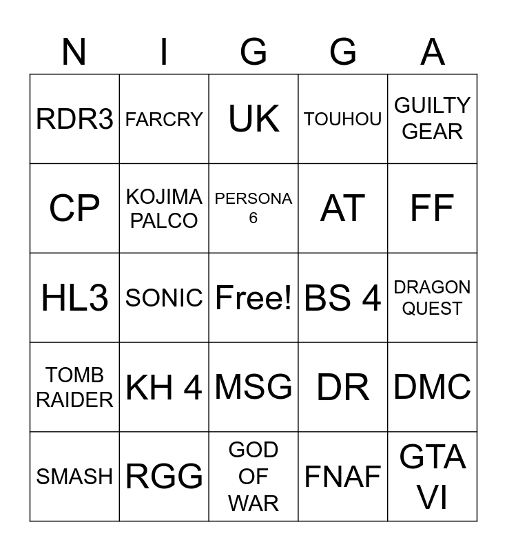 This bingo card has a free space and 24 words: KH 4, RGG, PERSONA 6, SMASH, GUILTY GEAR, RDR3, CP, FARCRY, BS 4, MSG, AT, HL3, DR, DMC, KOJIMA PALCO, FNAF, DRAGON QUEST, UK, FF, SONIC, GTA VI, TOMB RAIDER, TOUHOU and GOD OF WAR.
