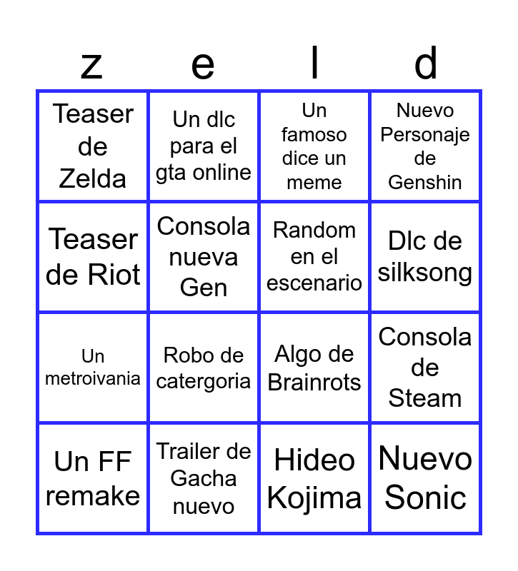 This bingo card has 16 words: Trailer de Gacha nuevo, Consola de Steam, Un famoso dice un meme, Teaser de Zelda, Un metroivania, Un dlc para el gta online, Algo de Brainrots, Hideo Kojima, Teaser de Riot, Consola nueva Gen, Un FF remake, Nuevo Personaje de Genshin, Robo de catergoria, Dlc de silksong, Random en el escenario and Nuevo Sonic.