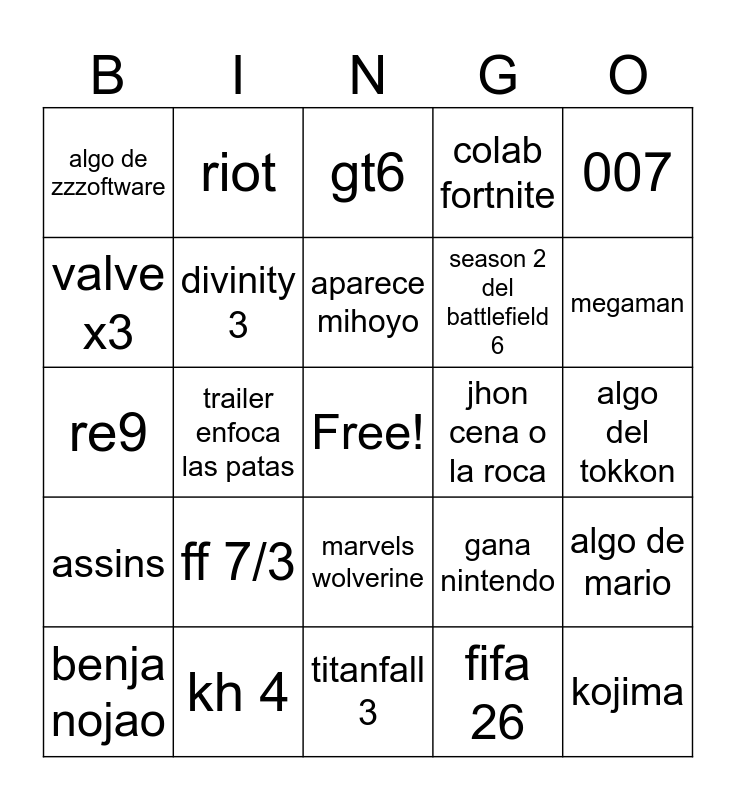 This bingo card has a free space and 24 words: ff 7/3, kh 4, aparece mihoyo, benja nojao, 007, algo de zzzoftware, valve x3, riot, jhon cena o la roca, marvels wolverine, season 2 del battlefield 6, re9, gana nintendo, algo de mario, divinity 3, fifa 26, algo del tokkon, gt6, megaman, trailer enfoca las patas, kojima, assins, colab fortnite and titanfall 3.