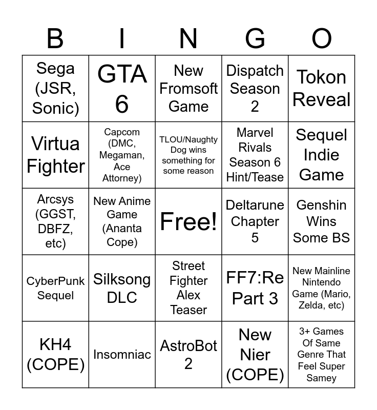 This bingo card has a free space and 24 words: Silksong DLC, Insomniac, TLOU/Naughty Dog wins something for some reason, KH4 (COPE), Tokon Reveal, Sega (JSR, Sonic), Virtua Fighter, GTA 6, Deltarune Chapter 5, Street Fighter Alex Teaser, Marvel Rivals Season 6 Hint/Tease, Arcsys (GGST, DBFZ, etc), FF7:Re Part 3, New Mainline Nintendo Game (Mario, Zelda, etc), Capcom (DMC, Megaman, Ace Attorney), New Nier (COPE), Genshin Wins Some BS, New Fromsoft Game, Sequel Indie Game, New Anime Game (Ananta Cope), 3+ Games Of Same Genre That Feel Super Samey, CyberPunk Sequel, Dispatch Season 2 and AstroBot 2.