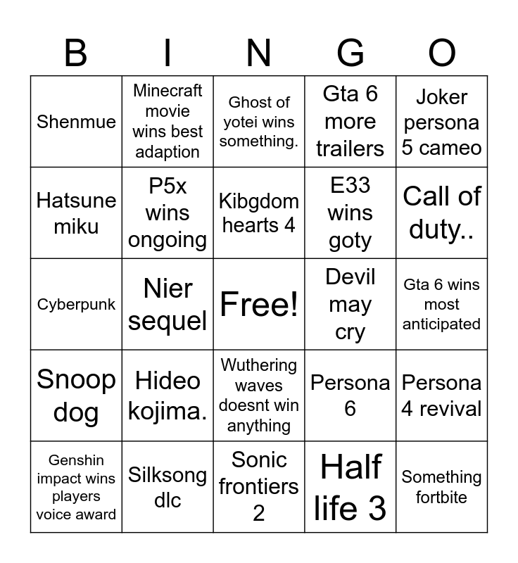 This bingo card has a free space and 24 words: Hideo kojima., Silksong dlc, Kibgdom hearts 4, Genshin impact wins players voice award, Joker persona 5 cameo, Shenmue, Hatsune miku, Minecraft movie wins best adaption, Devil may cry, Wuthering waves doesnt win anything, E33 wins goty, Cyberpunk, Persona 6, Persona 4 revival, P5x wins ongoing, Half life 3, Gta 6 wins most anticipated, Ghost of yotei wins something., Call of duty.., Nier sequel, Something fortbite, Snoop dog, Gta 6 more trailers and Sonic frontiers 2.
