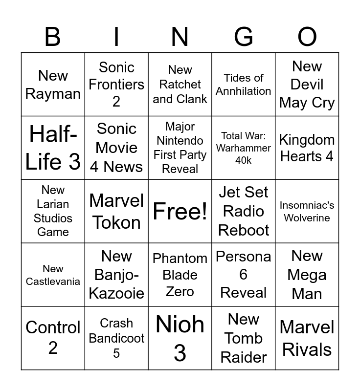 This bingo card has a free space and 24 words: New Banjo-Kazooie, Crash Bandicoot 5, Major Nintendo First Party Reveal, Control 2, New Devil May Cry, New Rayman, Half-Life 3, Sonic Frontiers 2, Jet Set Radio Reboot, Phantom Blade Zero, Total War: Warhammer 40k, New Larian Studios Game, Persona 6 Reveal, New Mega Man, Sonic Movie 4 News, New Tomb Raider, Insomniac's Wolverine, New Ratchet and Clank, Kingdom Hearts 4, Marvel Tokon, Marvel Rivals, New Castlevania, Tides of Annhilation and Nioh 3.