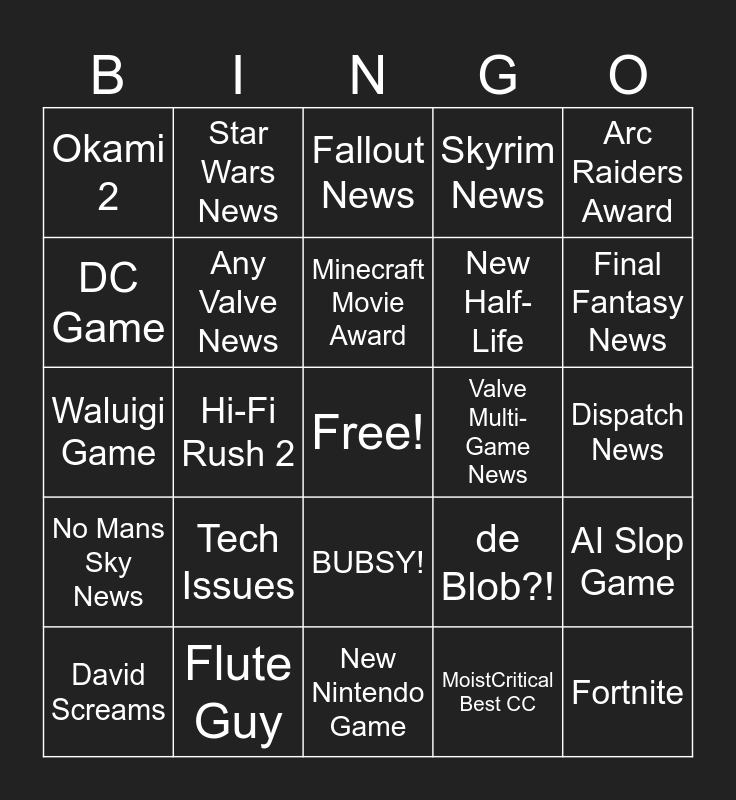 This bingo card has a free space and 55 words: New God of War, David Screams, Anime Game #100, Okami 2, New Nintendo Game, GTA 6 News, Any Valve News, New Hazelight Game, New Half-Life, Rabbids, Skyrim News, Silksong Award, New Sonic Game, New PS5 Exclusive, Nintendo Movie Trailer, Subnautica 2 News, Arc Raiders Award, Hi-Fi Rush 2, E33 Sweep, Fortnite, Valve Multi-Game News, Minecraft, de Blob?!, Fallout News, New Fromsoft Game, Minecraft Movie Award, MoistCritical Best CC, Silksong DLC, Dispatch News, AI Slop Game, PEAK, New F-Zero, Hytale News, Marvel Game, DC Game, Waluigi Game, Astro Bot News, No Mans Sky News, Light No Fire News, Killer Bean News, Star Wars News, Stage Trespasser, FNAF News, Slip Up, Tech Issues, Flute Guy, Palword News, 6 7, Xenoblade News, Final Fantasy News, DMC News, RE9 News, GLOVER!, BUBSY! and Someone Joins Discord Call Mid-Watch.