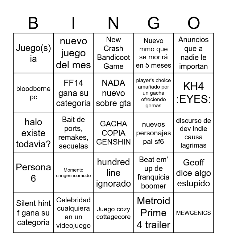 This bingo card has a free space and 24 words: Momento cringe/incomodo, Celebridad cualquiera en un videojuego, NADA nuevo sobre gta, Silent hint f gana su categoria, Anuncios que a nadie le importan, Juego(s) ia, bloodborne pc, nuevo juego del mes, nuevos personajes pal sf6, hundred line ignorado, player's choice amañado por un gacha ofreciendo gemas, halo existe todavia?, Beat em' up de franquicia boomer, Geoff dice algo estupido, FF14 gana su categoria, Metroid Prime 4 trailer, discurso de dev indie causa lagrimas, New Crash Bandicoot Game, KH4 :EYES:, Bait de ports, remakes, secuelas, MEWGENICS, Persona 6, Nuevo mmo que se morirá en 5 meses and Juego cozy cottagecore.