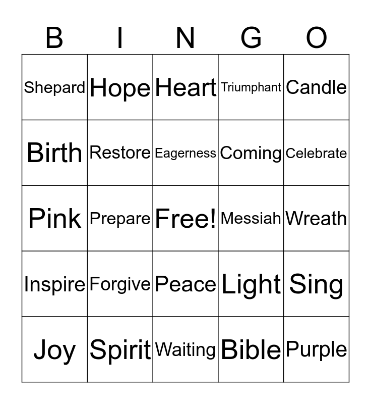 This bingo card has a free space and 29 words: Joy, Hope, Prepare, Mary, Shepard, Heart, Restore, Forgive, Messiah, Spirit, Wreath, Purple, Waiting, Bible, Celebrate, Rejoice, Peace, Inspire, Candle, Pink, Light, Solemn, Coming, Birth, Triumphant, Hope, Sing, Eagerness and Coming.