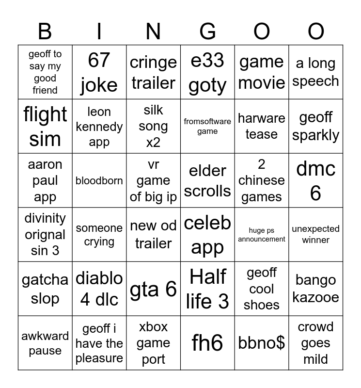 This bingo card has 36 words: Half life 3, gta 6, fh6, flight sim, divinity orignal sin 3, elder scrolls, leon kennedy app, xbox game port, game movie, geoff cool shoes, geoff sparkly, e33 goty, bango kazooe, bloodborn, fromsoftware game, geoff to say my good friend, gatcha slop, 2 chinese games, aaron paul app, cringe trailer, vr game of big ip, someone crying, celeb app, new od trailer, huge ps announcement, 67 joke, harware tease, geoff i have the pleasure, silk song x2, a long speech, crowd goes mild, awkward pause, unexpected winner, dmc 6, diablo 4 dlc and bbno$.