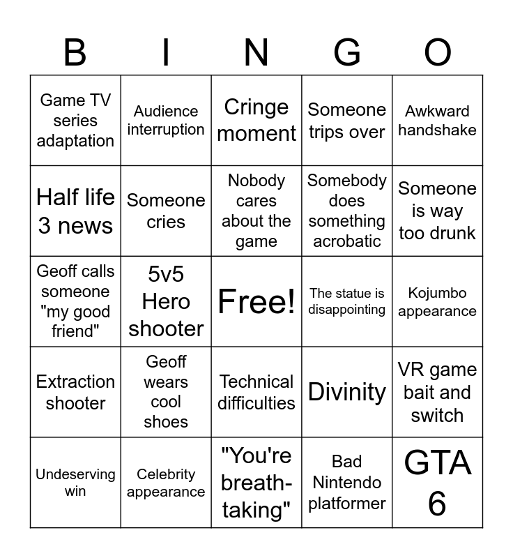 This bingo card has a free space and 24 words: Geoff wears cool shoes, Celebrity appearance, Nobody cares about the game, Undeserving win, Awkward handshake, Game TV series adaptation, Half life 3 news, Audience interruption, The statue is disappointing, Technical difficulties, Somebody does something acrobatic, Geoff calls someone "my good friend", Divinity, VR game bait and switch, Someone cries, Bad Nintendo platformer, Kojumbo appearance, Cringe moment, Someone is way too drunk, 5v5 Hero shooter, GTA 6, Extraction shooter, Someone trips over and "You're breath-taking".