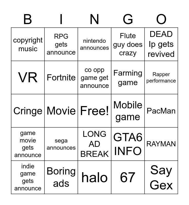 This bingo card has a free space and 40 words: Valve, Cringe, Hideo Kojima, Fortnite, Boring ads, LONG AD BREAK, co opp game get announce, NEW IP, DEAD Ip gets revived, game movie gets announce, Movie, Flute guy does crazy, Say Gex, PacMan, Mobile game, sega announces, Lucy mad, copyright music, SONY, nintendo announces, RAYMAN, 67, Farming game, VR, gay person, YAPPING, Mario, lucy recognizes one of the announcers, lucy predicts the winner of a category, xbox, half life 3, indie game gets announce, vtubers, GTA6 INFO, Rapper performance, halo, they tell someone to wrap it up, sonic, RPG gets announce and battle royal gets announce.
