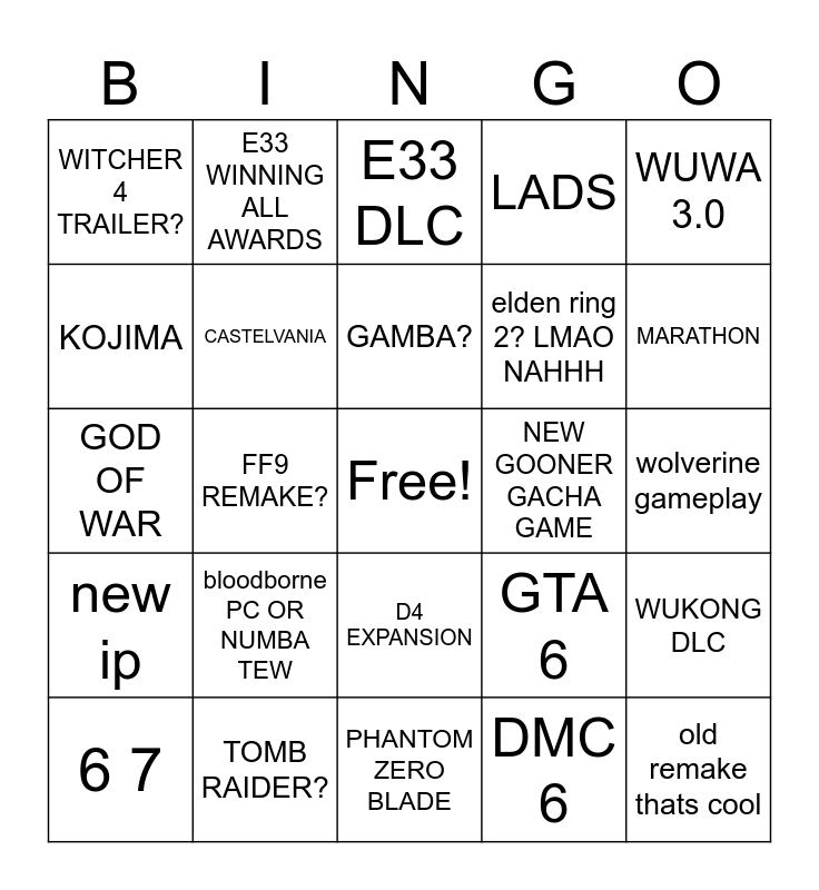 This bingo card has a free space and 24 words: bloodborne PC OR NUMBA TEW, TOMB RAIDER?, GAMBA?, 6 7, WUWA 3.0, WITCHER 4 TRAILER?, KOJIMA, E33 WINNING ALL AWARDS, NEW GOONER GACHA GAME, D4 EXPANSION, elden ring 2? LMAO NAHHH, GOD OF WAR, GTA 6, WUKONG DLC, CASTELVANIA, DMC 6, wolverine gameplay, E33 DLC, MARATHON, FF9 REMAKE?, old remake thats cool, new ip, LADS and PHANTOM ZERO BLADE.