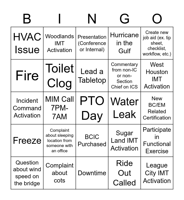 This bingo card has a free space and 24 words: Complaint about sleeping location from someone with an office, Complaint about cots, Lead a Tabletop, Question about wind speed on the bridge, Create new job aid (ex. tip sheet, checklist, workflow, etc.), HVAC Issue, Fire, Woodlands IMT Activation, Water Leak, BCIC Purchased, Commentary from non-IC or non-Section Chief on ICS, Incident Command Activation, Sugar Land IMT Activation, Participate in Functional Exercise, Toilet Clog, Ride Out Called, New BC/EM Related Certification, Presentation (Conference or Internal), West Houston IMT Activation, MIM Call 7PM-7AM, League City IMT Activation, Freeze, Hurricane in the Gulf and Downtime.