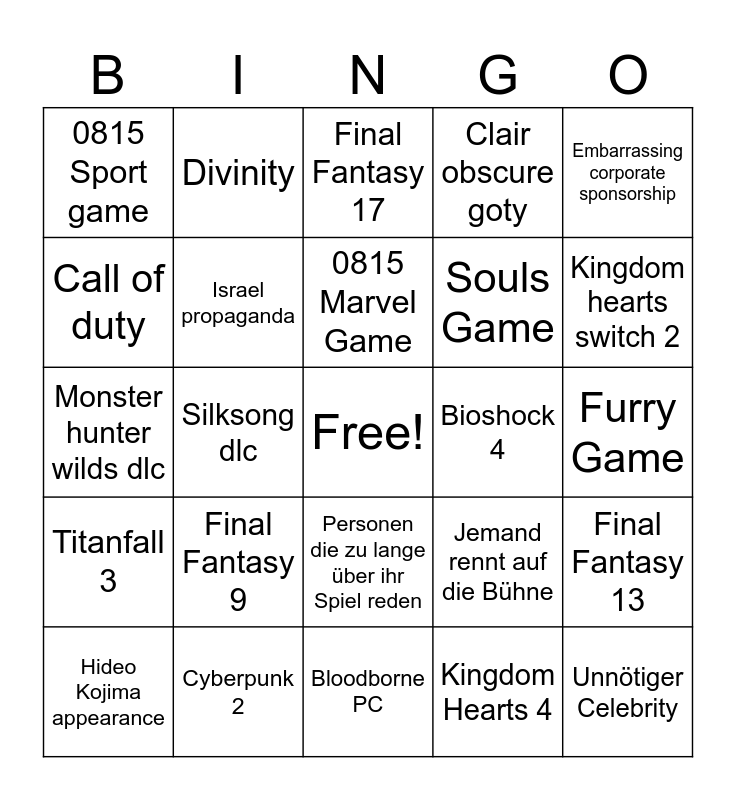 This bingo card has a free space and 24 words: Final Fantasy 9, Cyberpunk 2, 0815 Marvel Game, Hideo Kojima appearance, Embarrassing corporate sponsorship, 0815 Sport game, Call of duty, Divinity, Bioshock 4, Personen die zu lange über ihr Spiel reden, Souls Game, Monster hunter wilds dlc, Jemand rennt auf die Bühne, Final Fantasy 13, Israel propaganda, Kingdom Hearts 4, Furry Game, Final Fantasy 17, Kingdom hearts switch 2, Silksong dlc, Unnötiger Celebrity, Titanfall 3, Clair obscure goty and Bloodborne PC.