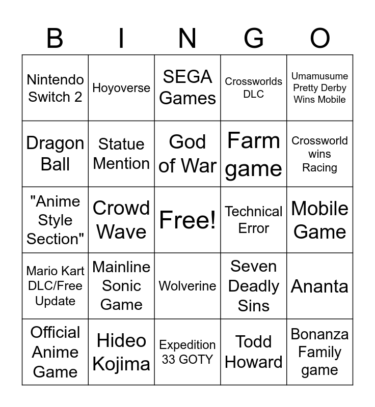 This bingo card has a free space and 24 words: Mainline Sonic Game, Hideo Kojima, God of War, Official Anime Game, Umamusume Pretty Derby Wins Mobile, Nintendo Switch 2, Dragon Ball, Hoyoverse, Technical Error, Wolverine, Farm game, "Anime Style Section", Seven Deadly Sins, Ananta, Statue Mention, Todd Howard, Mobile Game, SEGA Games, Crossworld wins Racing, Crowd Wave, Bonanza Family game, Mario Kart DLC/Free Update, Crossworlds DLC and Expedition 33 GOTY.