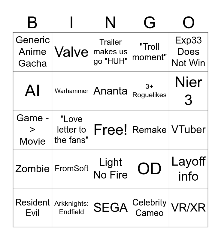 This bingo card has a free space and 24 words: FromSoft, Arkknights: Endfield, Ananta, Resident Evil, Exp33 Does Not Win, Generic Anime Gacha, AI, Valve, Remake, Light No Fire, 3+ Roguelikes, Game -> Movie, OD, Layoff info, Warhammer, Celebrity Cameo, VTuber, Trailer makes us go "HUH", Nier 3, "Love letter to the fans", VR/XR, Zombie, "Troll moment" and SEGA.