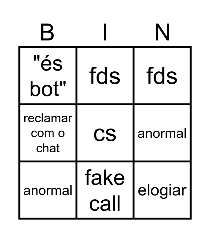 This bingo card has a free space and 17 words: fake call, "a tua mãe", fds, "és bot", elogiar, reclamar com o chat, fdp, anormal, fake call, anormal, fds, reclamar com o chat, elogiar, fds, fdp, fake call and "A tua mãe".