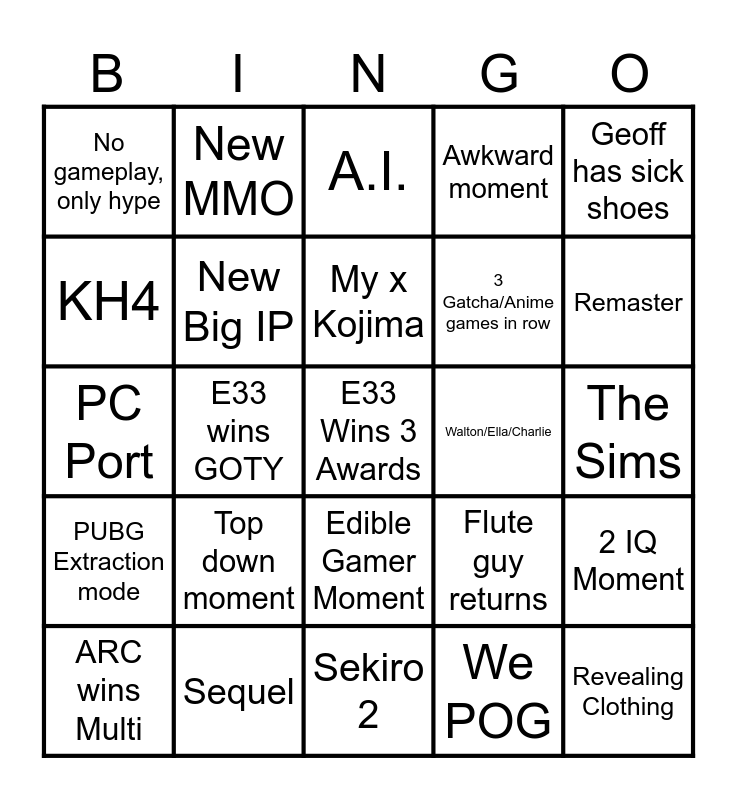 This bingo card has a free space and 24 words: Top down moment, Sequel, My x Kojima, ARC wins Multi, Geoff has sick shoes, No gameplay, only hype, KH4, New MMO, Walton/Ella/Charlie, Edible Gamer Moment, 3 Gatcha/Anime games in row, PC Port, Flute guy returns, 2 IQ Moment, New Big IP, We POG, The Sims, A.I., Remaster, E33 wins GOTY, Revealing Clothing, PUBG Extraction mode, Awkward moment and Sekiro 2.