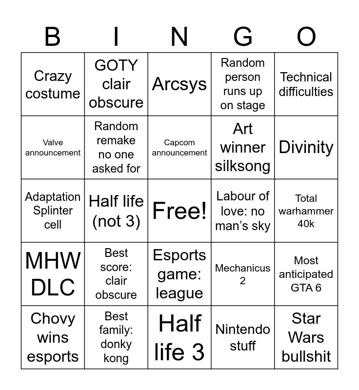 This bingo card has a free space and 24 words: Best score: clair obscure, Best family: donky kong, Capcom announcement, Chovy wins esports, Technical difficulties, Crazy costume, Valve announcement, GOTY clair obscure, Labour of love: no man’s sky, Esports game: league, Art winner silksong, Adaptation Splinter cell, Mechanicus 2, Most anticipated GTA 6, Random remake no one asked for, Nintendo stuff, Total warhammer 40k, Arcsys, Divinity, Half life (not 3), Star Wars bullshit, MHW DLC, Random person runs up on stage and Half life 3.