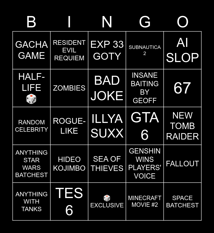 This bingo card has a free space and 24 words: HIDEO KOJIMBO, TES 6, BAD JOKE, ANYTHING WITH TANKS, AI SLOP, GACHA GAME, HALF-LIFE 🎲, RESIDENT EVIL REQUIEM, GTA 6, SEA OF THIEVES, INSANE BAITING BY GEOFF, RANDOM CELEBRITY, GENSHIN WINS PLAYERS' VOICE, FALLOUT, ZOMBIES, MINECRAFT MOVIE #2, NEW TOMB RAIDER, EXP 33 GOTY, 67, ROGUE-LIKE, SPACE BATCHEST, ANYTHING STAR WARS BATCHEST, SUBNAUTICA 2 and 🎲EXCLUSIVE.
